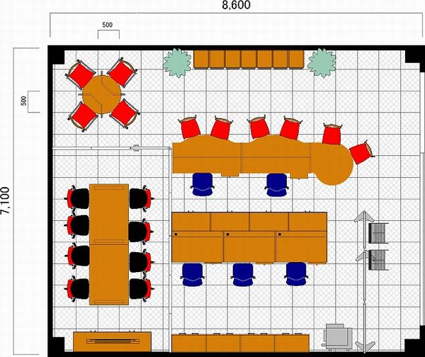 パッケージ内容詳細カウンター w1600×d900mm 2台デスク サイズ w1200×d710mmサイドキャビネット 各1台 鍵付ミーティング・応接 4人×1箇所8人×1箇所収納 w900×20段その他 スチール間仕切りマガジンラックパンフレットスタンド床材はオプションです。