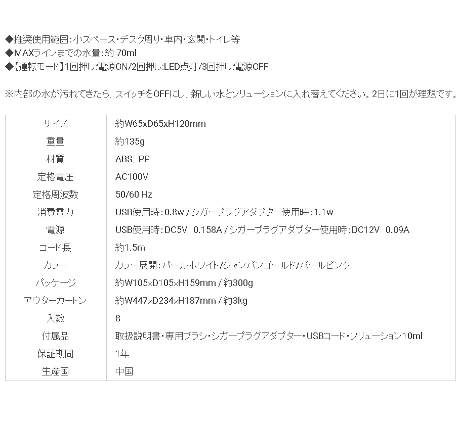 ◆推奨使用範囲:小スペース・デスク周り・車内・玄関・トイレ等 ◆MAXラインまでの水量:約 70ml ◆【運転モード】1回押し:電源ON/2回押し:LED点灯/3回押し:電源OFF ※内部の水が汚れてきたら、スイッチをOFFにし、新しい水とソリューションに入れ替えてください。
